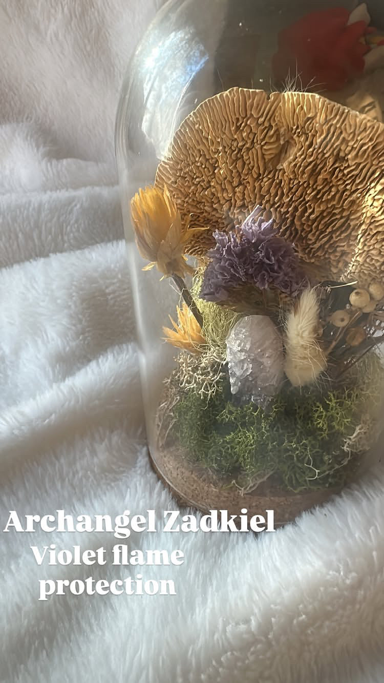 A beautiful intuitively curated dome in ode of the Archangel Zadkiel, who is the true embodiment and guide for the Violet flame. The Violet flame is a ceremonial practice and devotion you can attune yourself to that helps support energetic and physical release, burning away anything that doesn’t serve you. The amethyst is a companion crystal that aids you in stress relief. Zadkiel wants to help assist you along your journey, and grant a sense of trust in th e process of life!